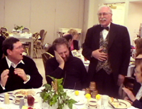 His manner is lighthearted as he moves from one small group to another. He appears in formal wear at elegant cocktail and dinner parties, receptions and other formal gatherings.