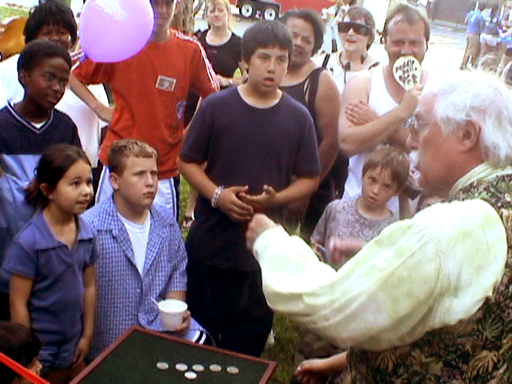 Gerald appears in "street performing" attire at company picnics, festivals and other informal functions. His attire is always appropriate for the occasion. His incredible sleight-of-hand with playing cards, coins and other small objects gives spectators something to talk about (other than the weather!