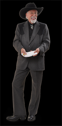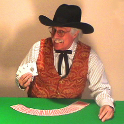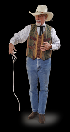 "Dress-up" Western attire a great for more formal occasions with a western theme. He entertains with playing cards, silver dollars, ropes and other props which fit the western theme.